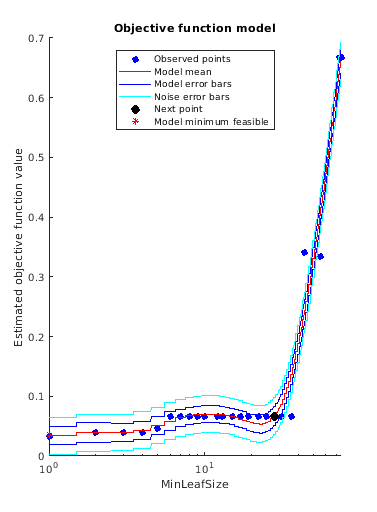 |======================================================================================| | Iter | Eval | Objective | Objective | BestSoFar | BestSoFar | MinLeafSize | | | result | | runtime | (observed) | (estim.) | | |======================================================================================| | 1 | Best | 0.066667 | 0.67228 | 0.066667 | 0.066667 | 31 | | 2 | Accept | 0.066667 | 0.1846 | 0.066667 | 0.066667 | 12 | | 3 | Best | 0.04 | 0.12593 | 0.04 | 0.040003 | 2 | | 4 | Accept | 0.66667 | 0.11694 | 0.04 | 0.15796 | 73 | | 5 | Accept | 0.04 | 0.15143 | 0.04 | 0.040009 | 2 | | 6 | Accept | 0.04 | 0.093603 | 0.04 | 0.040007 | 3 | | 7 | Accept | 0.66667 | 0.10336 | 0.04 | 0.040007 | 75 | | 8 | Accept | 0.046667 | 0.11544 | 0.04 | 0.04001 | 5 | | 9 | Best | 0.033333 | 0.087598 | 0.033333 | 0.03335 | 1 | | 10 | Accept | 0.066667 | 0.083954 | 0.033333 | 0.03335 | 19 | | 11 | Accept | 0.066667 | 0.088671 | 0.033333 | 0.033349 | 8 | | 12 | Accept | 0.066667 | 0.11436 | 0.033333 | 0.033348 | 25 | | 13 | Accept | 0.04 | 0.092566 | 0.033333 | 0.033347 | 4 | | 14 | Accept | 0.033333 | 0.087882 | 0.033333 | 0.03334 | 1 | | 15 | Accept | 0.066667 | 0.090919 | 0.033333 | 0.033339 | 6 | | 16 | Accept | 0.033333 | 0.097943 | 0.033333 | 0.033337 | 1 | | 17 | Accept | 0.033333 | 0.09267 | 0.033333 | 0.033336 | 1 | | 18 | Accept | 0.34 | 0.088194 | 0.033333 | 0.033336 | 44 | | 19 | Accept | 0.066667 | 0.096547 | 0.033333 | 0.033336 | 15 | | 20 | Accept | 0.066667 | 0.088582 | 0.033333 | 0.033336 | 10 | |======================================================================================| | Iter | Eval | Objective | Objective | BestSoFar | BestSoFar | MinLeafSize | | | result | | runtime | (observed) | (estim.) | | |======================================================================================| | 21 | Accept | 0.066667 | 0.085877 | 0.033333 | 0.033336 | 36 | | 22 | Accept | 0.066667 | 0.095332 | 0.033333 | 0.033336 | 22 | | 23 | Accept | 0.066667 | 0.099134 | 0.033333 | 0.033336 | 7 | | 24 | Accept | 0.33333 | 0.093971 | 0.033333 | 0.03409 | 55 | | 25 | Accept | 0.04 | 0.089517 | 0.033333 | 0.034069 | 2 | | 26 | Accept | 0.04 | 0.11739 | 0.033333 | 0.034036 | 3 | | 27 | Accept | 0.04 | 0.091491 | 0.033333 | 0.03401 | 4 | | 28 | Accept | 0.066667 | 0.097799 | 0.033333 | 0.033977 | 17 | | 29 | Accept | 0.066667 | 0.1056 | 0.033333 | 0.033949 | 9 | | 30 | Accept | 0.066667 | 0.092445 | 0.033333 | 0.033926 | 13 |