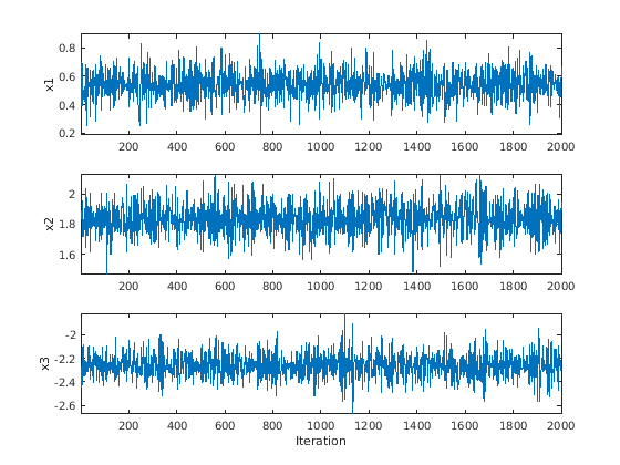 После получения случайной выборки исследуйте проблемы, такие как сходимость и смешивание, чтобы определить, представляют ли выборки разумный набор случайной реализации от целевого распределения. Чтобы исследовать выход, постройте графики трассировки выборок для первых нескольких переменных с помощью первой цепи.