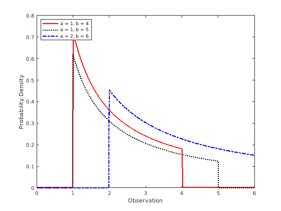 figure; plot(x,pdf1,'r','LineWidth',2); hold on; plot(x,pdf2,'k:','LineWidth',2); plot(x,pdf3,'b-.','LineWidth',2); legend({'a = 1, b = 4','a = 1, b = 5','a = 2, b = 6'},'Location','northwest'); xlabel('Observation') ylabel('Probability Density') hold off;