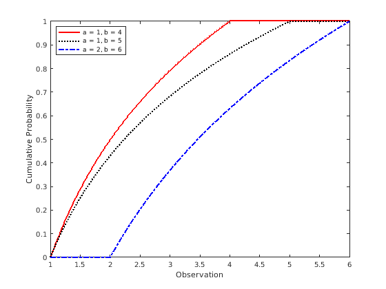 figure; plot(x,cdf1,'r','LineWidth',2); hold on; plot(x,cdf2,'k:','LineWidth',2); plot(x,cdf3,'b-.','LineWidth',2); legend({'a = 1, b = 4','a = 1, b = 5','a = 2, b = 6'},'Location','NW'); xlabel('Observation') ylabel('Cumulative Probability') hold off;
