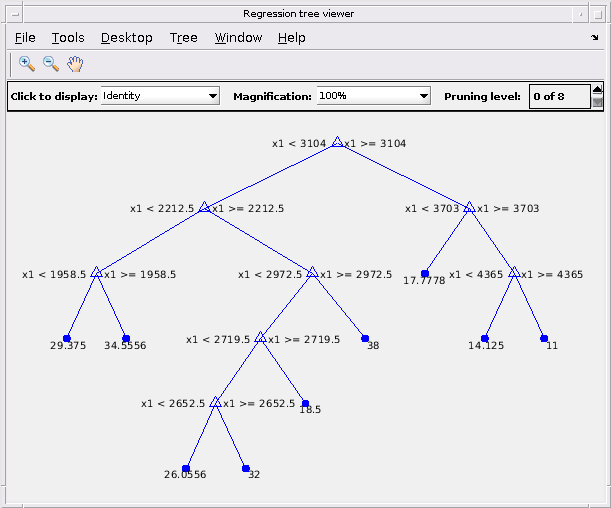 Figure Regression tree viewer contains an axes object and other objects of type uimenu, uicontrol. The axes object contains 30 objects of type line, text.