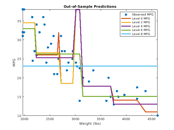Figure contains an axes object. The axes object with title Out-of-Sample Predictions contains 6 objects of type line. These objects represent Observed MPG, Level 0 MPG, Level 2 MPG, Level 4 MPG, Level 6 MPG, Level 8 MPG.
