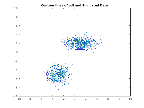 hold on scatter(X(:,1),X(:,2),10,'.') % Scatter plot with points of size 10 title('Contour lines of pdf and Simulated Data')