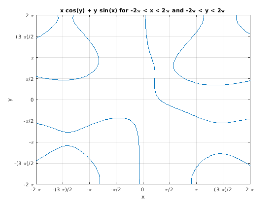 syms x y eqn = x*cos(y) + y*sin(x) == 1; fimplicit(eqn, [-2*pi 2*pi]) grid on title('x cos(y) + y sin(x) for -2\pi < x < 2\pi and -2\pi < y < 2\pi') xlabel('x') ylabel('y') ax = gca; S = sym(ax.XLim(1):pi/2:ax.XLim(2)); ax.XTick = double(S); ax.XTickLabel = arrayfun(@texlabel, S, 'UniformOutput', false); S = sym(ax.YLim(1):pi/2:ax.YLim(2)); ax.YTick = double(S); ax.YTickLabel = arrayfun(@texlabel, S, 'UniformOutput', false);