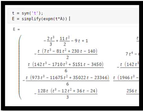 Матричный экспоненциал, expm (t*A), обычно описывается в терминах скалярных экспоненциалов, включающих собственные значения, exp (lambda (i) *t). Но для этой матрицы, элементами expm (t*A) являются все полиномы в t.