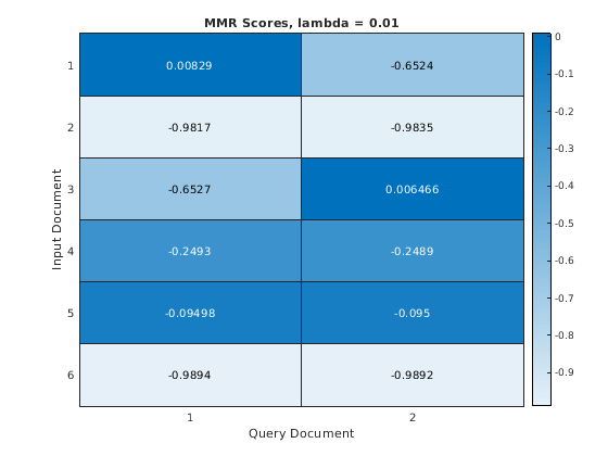 Теперь вычислите баллы снова и установите значение lambda к 0,01. Когда значение lambda близко к 0, избыточное выражение документов более низкие баллы и разнообразно (но менее важный для запроса), документы дают к более высоким баллам.