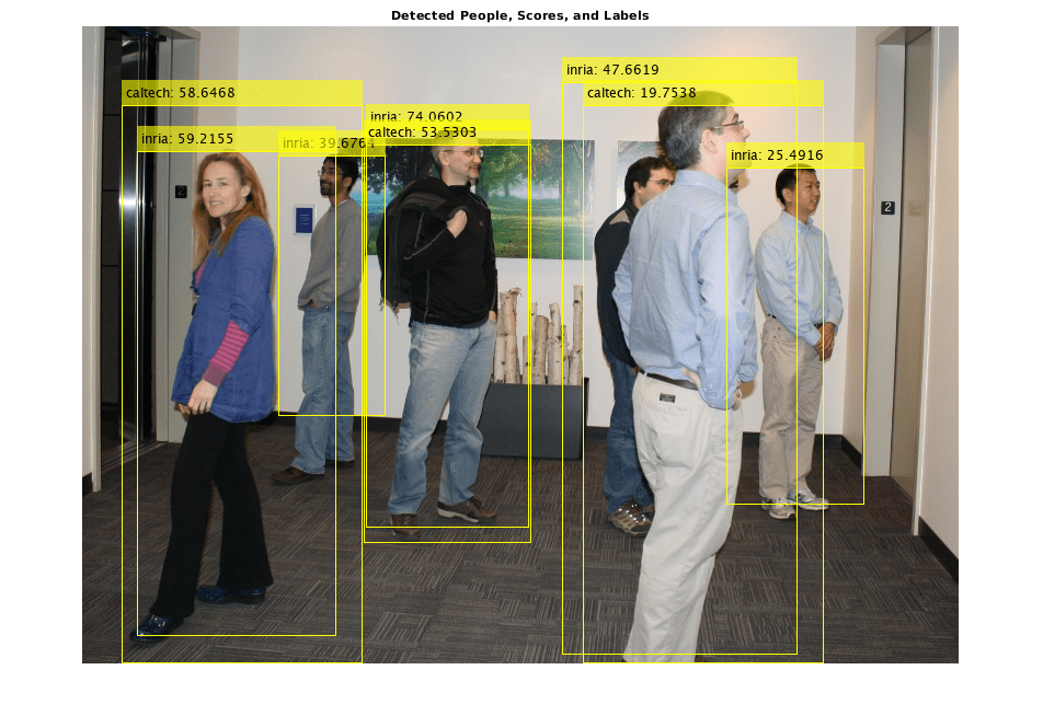 I = imread('visionteam1.jpg'); [bboxesInria,scoresInria] = detect(detectorInria,I,'SelectStrongest',false); [bboxesCaltech,scoresCaltech] = detect(detectorCaltech,I,'SelectStrongest',false);