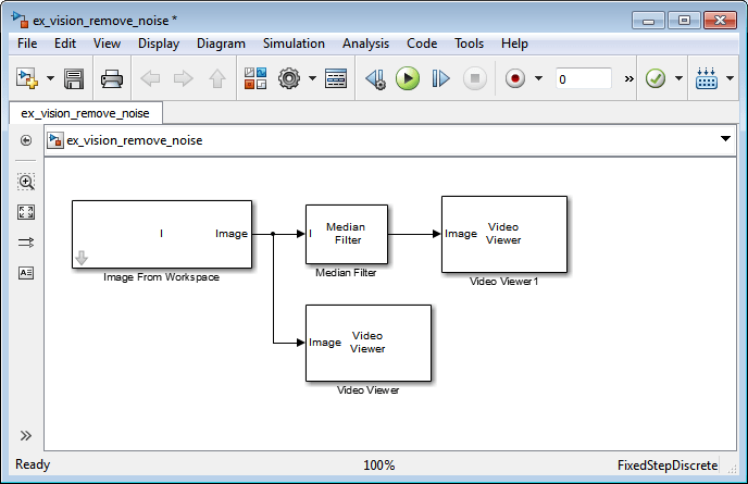 Используйте блоки Video Viewer, чтобы отобразить исходное шумное изображение и модифицированное изображение. Изображения представлены 8-битным беззнаковым целым. Поэтому значение 0 соответствует черный, и значение 255 соответствует белый. Примите параметры по умолчанию.