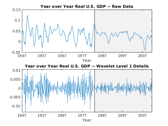 Дискретный вейвлет преобразовывает (DWTs), включая максимальное перекрытие дискретный вейвлет преобразовывает (MODWT), анализируйте сигналы и изображения в прогрессивно более прекрасные полосы октавы. Этот анализ мультиразрешения позволяет вам выявить закономерности, которые не отображаются в необработанных данных. Можно использовать вейвлеты, чтобы получить многошкальные оценки отклонения сигнала или измерить многошкальную корреляцию между двумя сигналами. Можно также восстановить сигнал (1-D) и отобразить (2D) приближения, которые сохраняют только желаемые функции и сравнивают распределение энергии в сигналах через диапазоны частот. Shearlets обеспечивают разреженные приближения анизотропных функций в изображениях. Пакеты вейвлета предоставляют семейству преобразований, которые делят содержимое частоты сигналов и изображений на прогрессивно более прекрасные интервалы равной ширины.