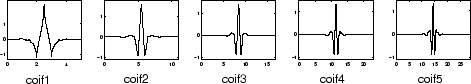 Созданный мной. Daubechies по требованию Р. Койфмана. Функция вейвлета имеет 2N, моменты, равные 0 и масштабирующаяся функция, имеют 2N-1 моменты, равные 0. Две функции имеют поддержку длины 6N-1. Можно получить обзор основных свойств этого семейства путем ввода waveinfo('coif') из командной строки MATLAB. См. Вейвлеты Coiflet: coifN в Руководстве пользователя Wavelet Toolbox для большего количества детали.