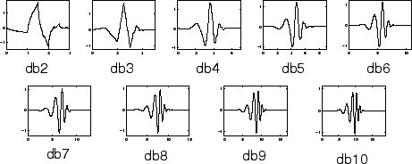 Именами вейвлетов семейства Daubechies является записанный dbN, где N порядок и db “фамилия” вейвлета. db1 вейвлет, как упомянуто выше, совпадает с Haar вейвлет. Вот функции вейвлета psi следующих девяти членов семейства: