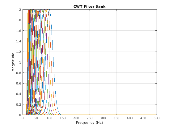 Использование cwtfilterbank создать набор фильтров непрерывного вейвлета преобразовывает (CWT). Вейвлетом по умолчанию, используемым в наборе фильтров, является аналитический Морзе (3,60) вейвлет. Можно варьироваться полоса пропускания времени и параметры симметрии для вейвлетов Морзе, чтобы настроить вейвлет Морзе для потребностей. Можно также использовать аналитический Morlet (Габор) вейвлет или ударить вейвлет. При анализе нескольких сигналов в частоте времени, для повышенной вычислительной эффективности, можно предварительно вычислить фильтры однажды и затем передать набор фильтров как вход к cwt. С набором фильтров можно визуализировать вейвлеты вовремя и частоту. Можно также создать наборы фильтров с определенной частотой или областями значений периода, и измерить полосы пропускания на 3 дБ. Можно определить добротность для вейвлетов в наборе фильтров.