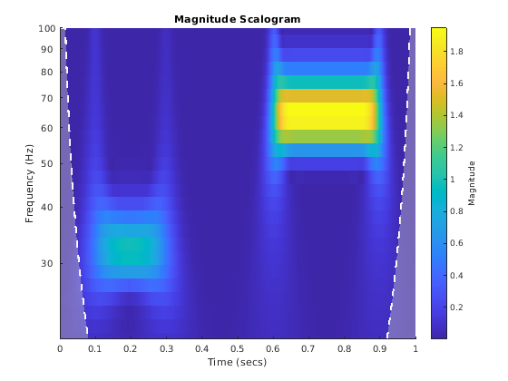 cwt функционируйте устанавливает время и оси частоты в scalogram. Создайте вектор, представляющий шаги расчета.
