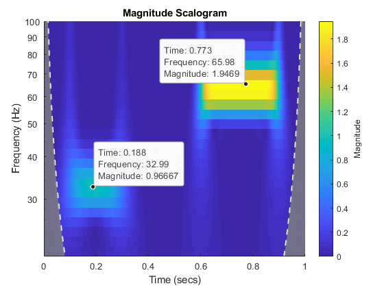 По умолчанию, для вейвлетов Морзе, частотная характеристика затухает к 50% пиковой величины в Найквисте. Для Morlet и вейвлетов удара, частотная характеристика затухает к 10% пиковой величины. Можно изменить процент затухания путем установки набора фильтров FrequencyLimits свойство. Смотрите cwtfreqbounds.