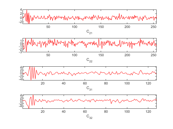 Выход detailCoeffs массив ячеек 1 на 4. Элементы массива ячеек содержат коэффициенты вейвлета, соответствующие элементам в outputindices. Например, подтвердите detailCoeffs{1} содержит уровень два коэффициента детали от первого дерева.