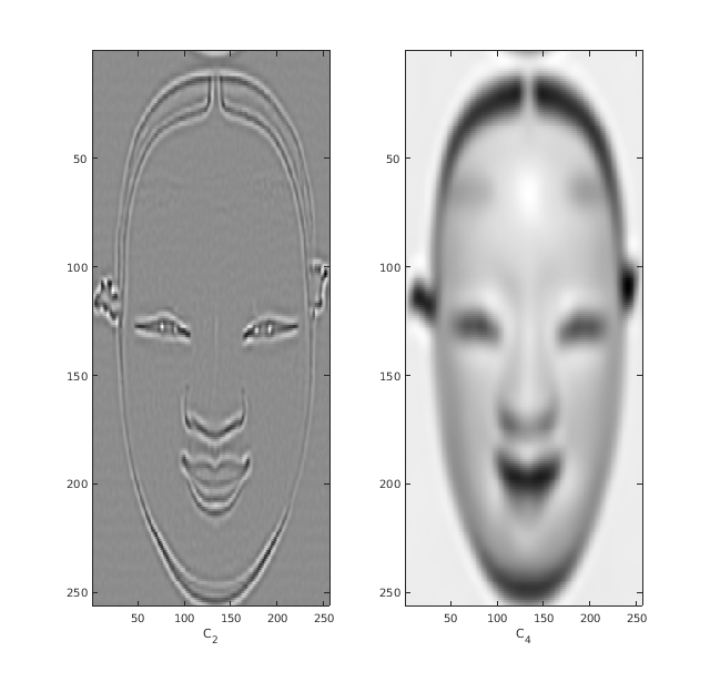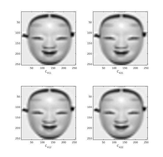 Загрузите в 256 256 рисунке маски. Сгенерируйте двухуровневое разложение вейвлета изображения для каждого типа преобразования. Наблюдайте размерности выходных коэффициентов.