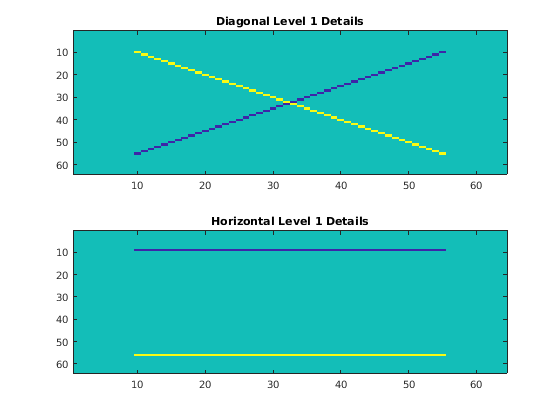 haart2 возвращает коэффициенты приближения, a, на самом грубом уровне. haart2 также возвращает массивы ячеек матриц, содержащих горизонталь, вертикальные, и диагональные коэффициенты детали уровнем. Если 2D Преобразование Хаара вычисляется только на одном уровне, более грубом в разрешении, то hV, и d матрицы. level по умолчанию зависит от количества строк x.