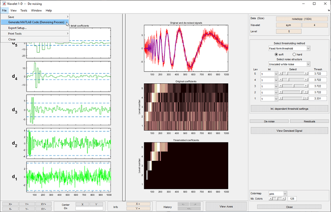 Можно сгенерировать MATLAB® код, чтобы воспроизвести основанное на приложении 1D шумоподавление вейвлета в командной строке. Необходимо выполнить эту операцию в инструменте Wavelet 1-D - - Denoising. Вы должны первый denoise ваш сигнал, прежде чем можно будет включить операцию File > Generate Matlab Code (Denoising Process).