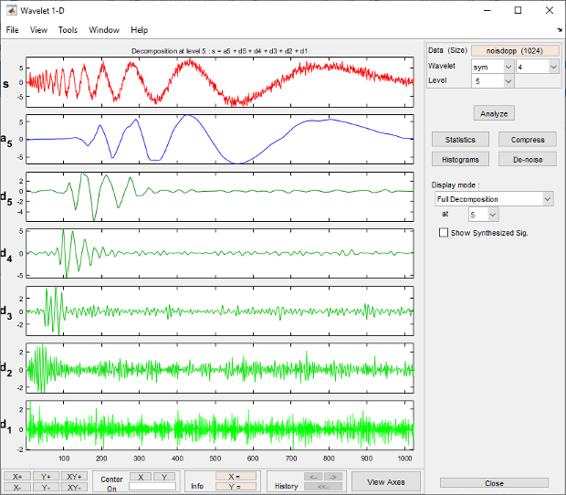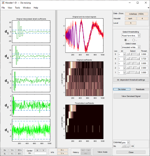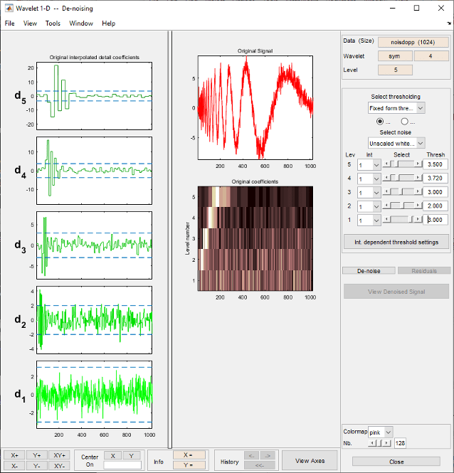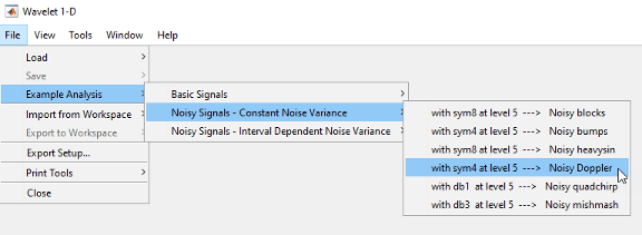 Загрузите шумный Доплеровский анализ в качестве примера. Выберите File > Example Analysis > Noisy Signals - Constant Noise Variance > with sym4 at level 5 - - -> Noisy Doppler.