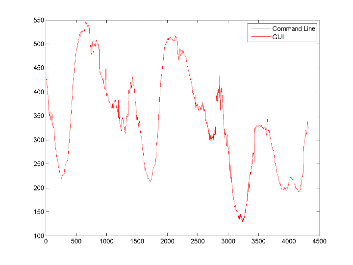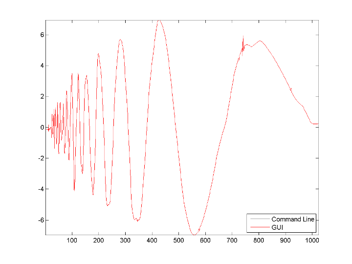 load denoiseddoppler; plot(sigDEN,'k'); axis tight; hold on; plot(denoiseddoppler,'r'); legend('Command Line','GUI','Location','SouthEast');