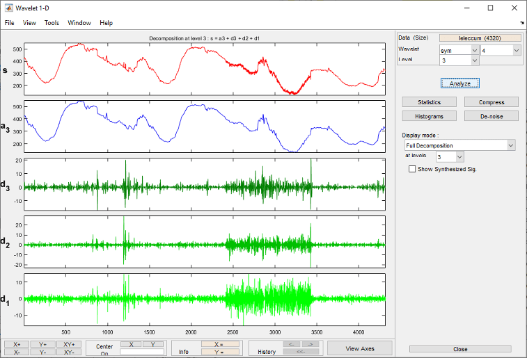 leleccum переменная. Нажмите ОК, чтобы импортировать данные.Выберите sym4 вейвлет и набор Level равняйтесь 3. Нажмите Analyze.