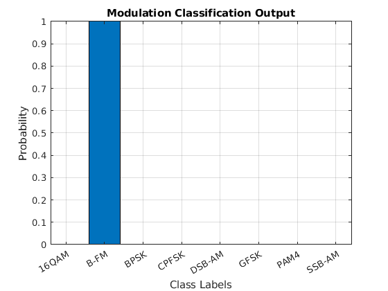 function helperPredVizPil(PredClassProb) % This function is only intended to support wavelet deep learning examples. % It may change or be removed in a future release. classNames = {'16QAM';'B-FM';'BPSK';'CPFSK';'DSB-AM';'GFSK';'PAM4';'SSB-AM'}; figure bar(PredClassProb) set(gca, 'XTickLabel' , classNames) xlabel('Class Labels') ylabel('Probability') title('Modulation Classification Output') axis tight grid on end