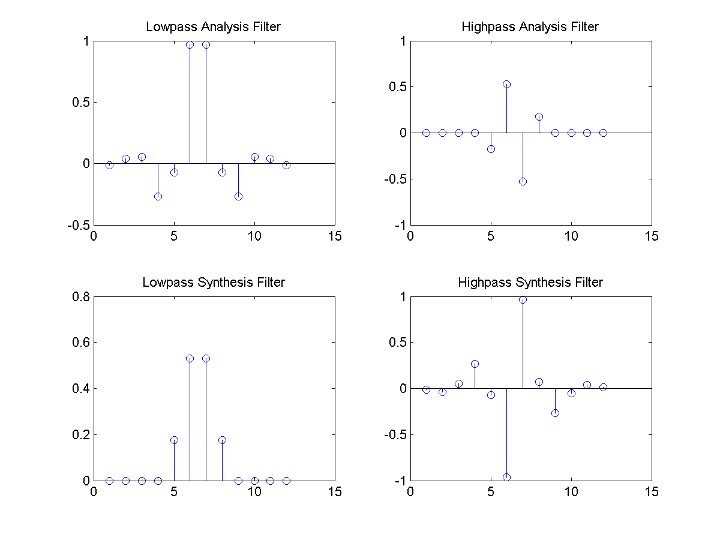 [LoD,HiD,LoR,HiR] = wfilters('bior3.5'); subplot(221); stem(LoD); title('Lowpass Analysis Filter'); subplot(222); stem(HiD); title('Highpass Analysis Filter'); subplot(223); stem(LoR); title('Lowpass Synthesis Filter'); subplot(224); stem(HiR); title('Highpass Synthesis Filter');