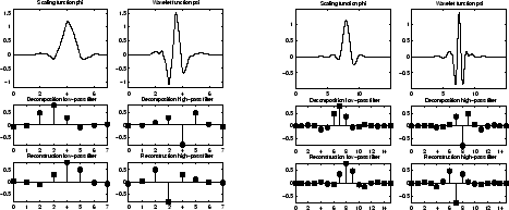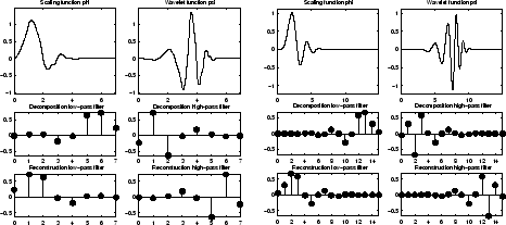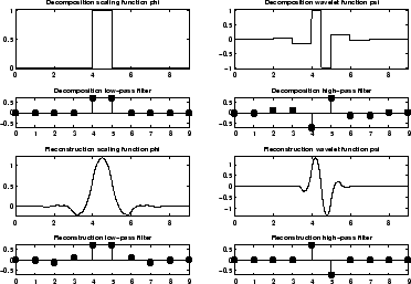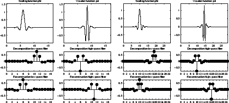 В дискретном анализе вейвлета фильтры анализа и синтеза более интересны, чем связанная функция масштабирования и вейвлет. Можно использовать wfilters получить фильтры анализа и синтеза.
