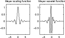 И ψ и φ заданы в частотном диапазоне, начиная со вспомогательной функции ν (см. страницы 117, 119, 137, 152 [Dau92]). Путем ввода waveinfo('meyr') в командной строке MATLAB можно получить обзор основных свойств этого вейвлета.