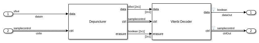 Декодирование поддержек блока проколотых кодов путем обеспечения дополнительного входного порта erasure. Можно использовать блок Depuncturer, чтобы вставить нейтральные значения в проколотый демонстрационный поток и сгенерировать сигнал erasure.
