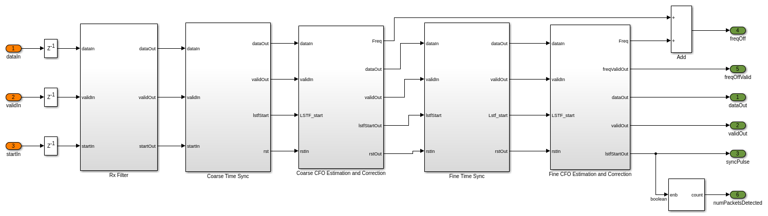 Модель в качестве примера принимает принятую форму волны как вход наряду с допустимым, и запустите сигналы. Модель возвращает синхронизируемую форму волны как выход наряду с допустимым сигналом. Другие выходные параметры в примере включают обнаруженный флаг пакета, оценку CFO наряду с его допустимым и количеством пакетов, обнаруженных как выход. Оценка CFO является суммой крупного CFO и прекрасных оценок CFO. wlanFrontEndInit скрипт предоставляет вход модели. wlanWaveformGenerator.m функция в скрипте генерирует кадр на 20 МГц VHT, который передается через канал TGac с профилем задержки Модели A. Аддитивный белый Гауссов шум (AWGN) в отношении сигнал-шум (SNR) на 30 дБ добавляется с другими ухудшениями канала CFO на 10 кГц и смещением синхронизации '25'.