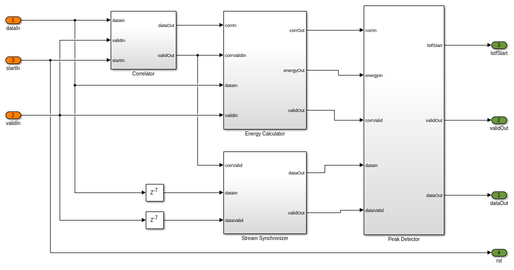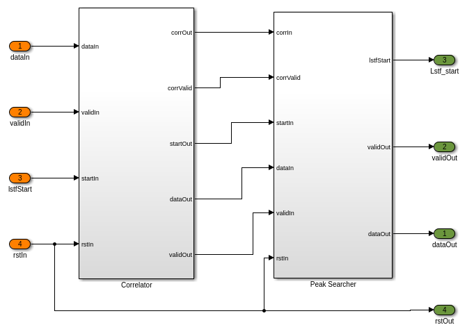 Крупный алгоритм синхронизации времени реализует двойное раздвижное окно для корреляции как описано в функции MATLAB wlanPacketDetect.m. Крупная подсистема Синхронизации Времени использует автокорреляцию устаревшего короткого учебного поля (L-STF) символы, чтобы возвратить предполагаемое смещение запуска пакет. Пиковая подсистема Детектора сравнивает метрики корреляции с энергией сигналов и определяет запуск пакета. На следующем этапе прекрасное обнаружение символьной синхронизации совершенствовало этот пакет, запускают оценку с помощью устаревшего длинного учебного поля (L-LTF).