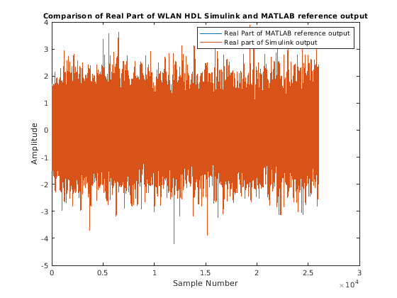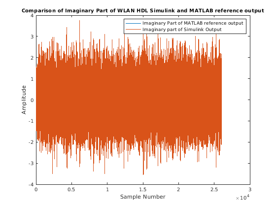 plot(real(matOut)); hold on; simOut = simOut(1:length(matOut)); plot(real(simOut)); title('Comparison of Real Part of WLAN HDL Simulink and MATLAB reference output','FontSize', 10); xlabel('Sample Number'); ylabel('Amplitude'); legend('Real Part of MATLAB reference output','Real part of Simulink output'); figure; plot(imag(matOut)); hold on; simOut = simOut(1:length(matOut)); plot(imag(simOut)); title('Comparison of Imaginary Part of WLAN HDL Simulink and MATLAB reference output','FontSize', 10); xlabel('Sample Number'); ylabel('Amplitude'); legend('Imaginary Part of MATLAB reference output','Imaginary part of Simulink Output');