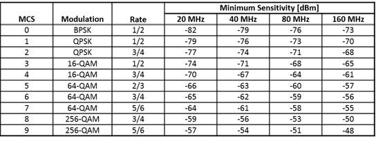 Тест чувствительности минимума приемника гарантирует, что устройство под тестом (DUT) получает данные с заданным максимальным пакетным коэффициентом ошибок (PER) 10% в заданной минимальной степени сигнала. Минимальная степень сигнала зависит от полосы пропускания канала и схемы модуляции и кодирования (MCS), как задано в Таблице 22-25 стандарта IEEE 802.11ac [1]: