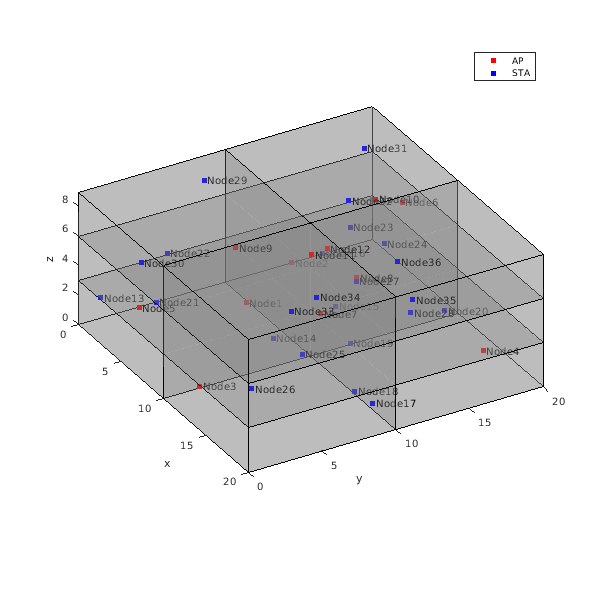 Каждая комната имеет точку доступа (AP) и две станции (STAs), помещенный в случайный x-и y-местоположения на высоте 1,5 метров от пола.