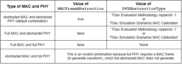 Эта таблица показывает вас, как переключиться между абстрактным и полным MAC или PHY путем конфигурирования значений MACFrameAbstraction и PHYAbstractionType введите параметры.