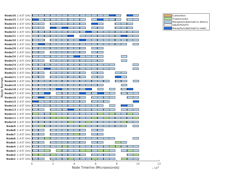 rng(1, 'combRecursive'); % Seed for random number generator simulationTime = 100; % Simulation time in milliseconds showLiveStateTransitionPlot = true; % Show live state transition plot for all nodes displayStatistics = true; % Display statistics at the end of the simulation % Add the folder to the path for access to all helper files addpath(genpath(fullfile(pwd, 'mlWLANSystemSimulation')));