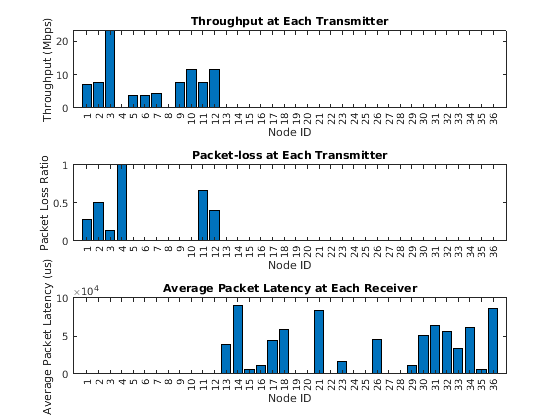 % Plot the throughput, packet loss ratio, and average packet latency at each node